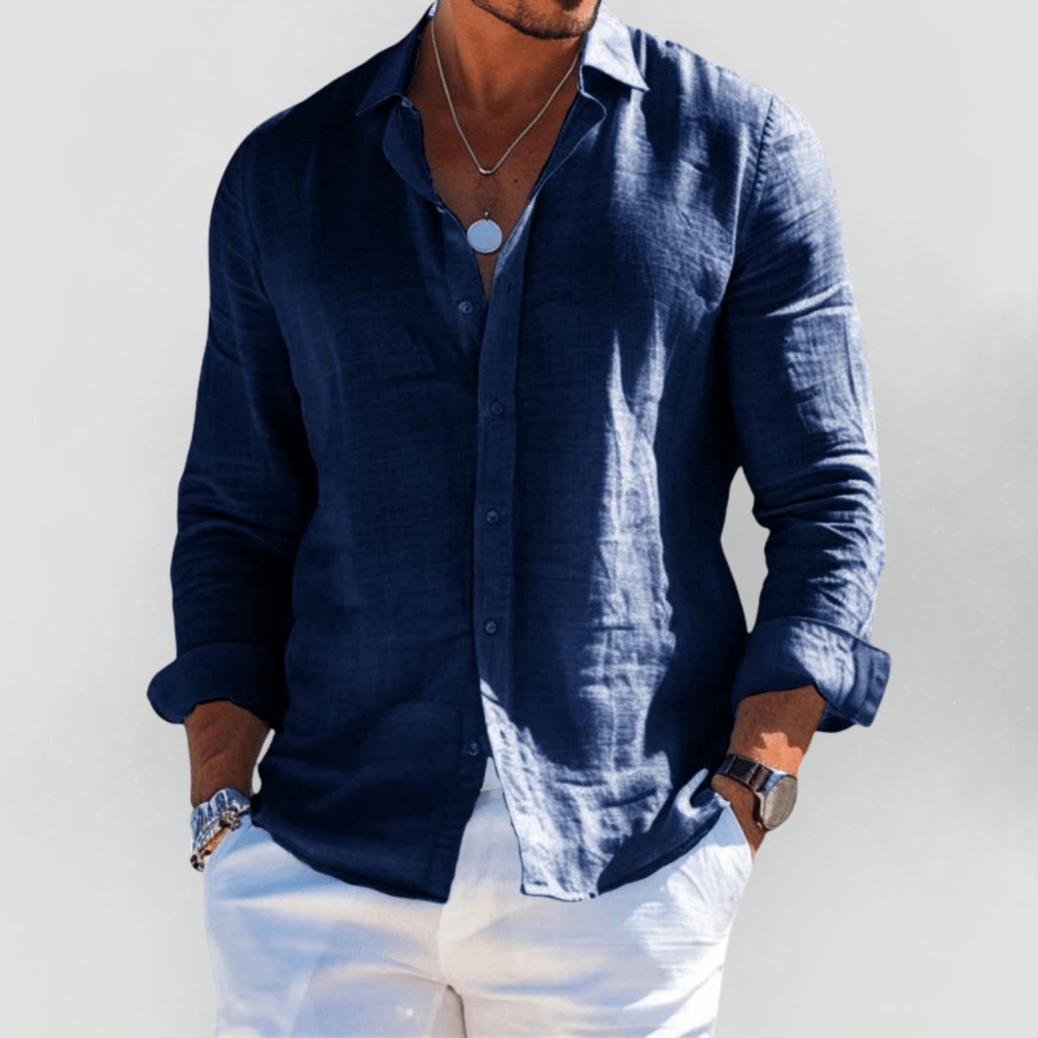 Med opprullede ermer og åpen krage utstråler du selvtillit uten å overdrive.